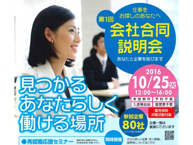 平成28年10月25日(火)12:00~16:00、刈谷市産業振興センター・あいおいホール(刈谷市相生町1-1-6)で開催される、愛知県労働協会主催の会社合同説明会に出展します。