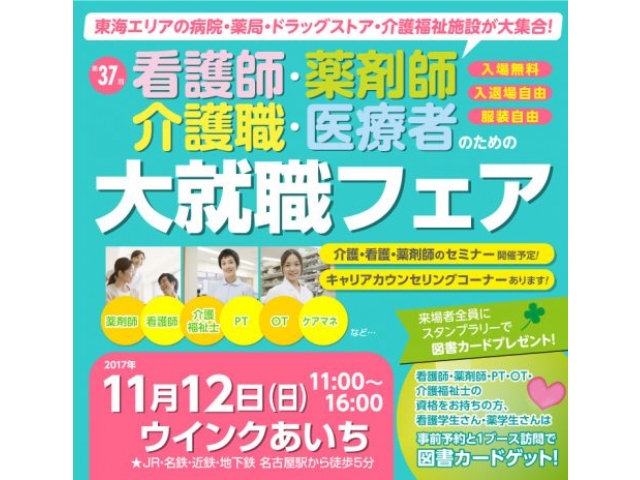 平成29年11月12日(日)にウインクあいち(名古屋市中村区名駅4丁目4-38)にて開催される「保育士のための大就職フェア」に出展いたします。