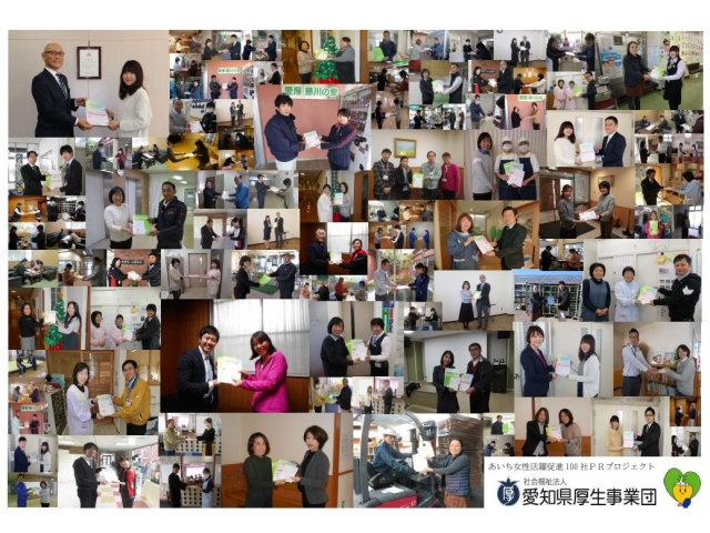 この度は「あいち女性の活躍促進100社PRプロジェクト」と題して、各施設の取引企業任意の5社(保育園は3社)計100社にPR資材を手渡し、女性活躍促進のPRを行いました。