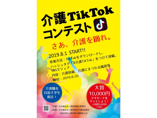 ◆介護職をめざす学生の皆さんへ◆『介護TikTokコンテスト』開催します!!介護にまつわる動画をお気に入りの音楽に乗せて投稿してください♬ハッシュタグ「#介護TikTok」をつけてTikTok上に投稿してもらった作品の中から大賞、人気賞を選び、クオカード10,000円、5,000円をプレゼント!🎊人事担当が学校へお届けに飛んでいきます💨後援:愛知県社会福祉協議会、愛知県介護福祉士会 締切りは8/20まで!