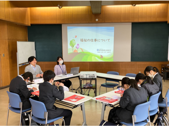 訪問当日、緊張した面持ちで事務局にやって来た生徒さんをお迎えし、人事担当より「福祉の仕事ってどんなことがあるの?」「愛知県厚生事業団ではどんなことをしているの?」といったことを中心に1時間半程度お話をさせていただきました。