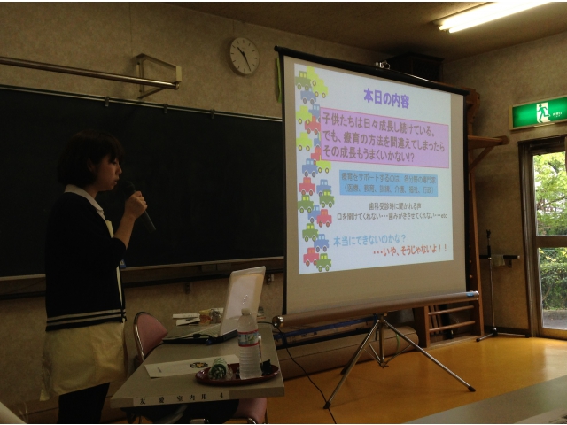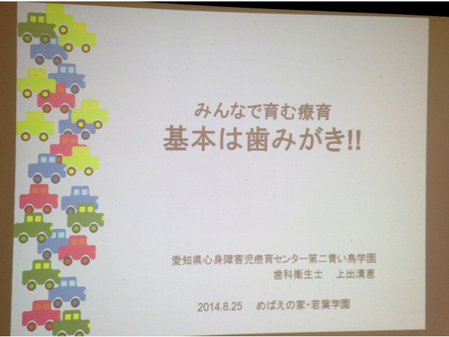 8月25日(月)、障がい児等療育支援事業にて、岡崎市の福祉の村、若葉学園・めばえの家を通園されているお子さんの保護者を対象に、口腔ケアに関する講話、ブラッシング指導を実施しました。
