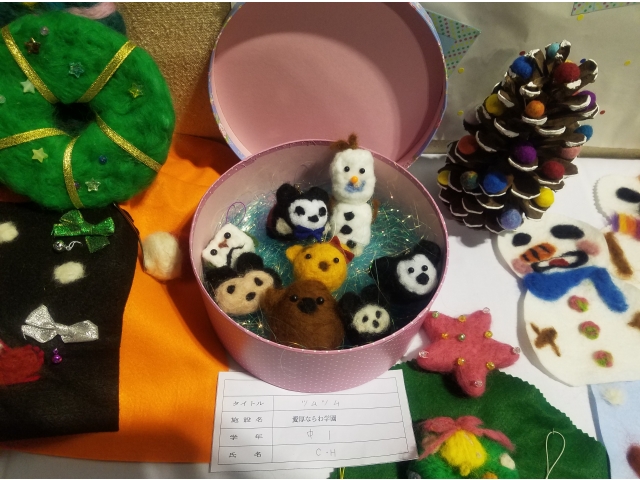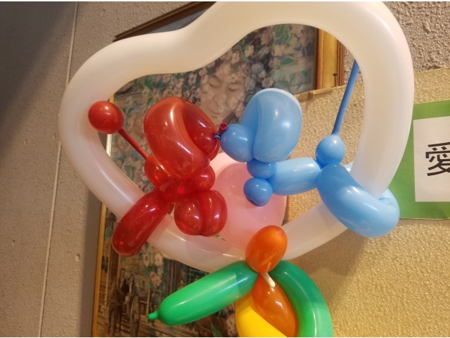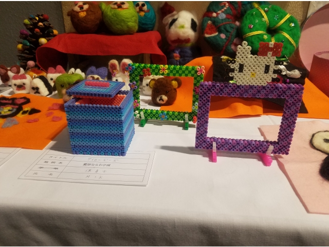 同時開催の作品展では、手芸クラブの作品と職員のアイロンビーズ、バルーンアートを
