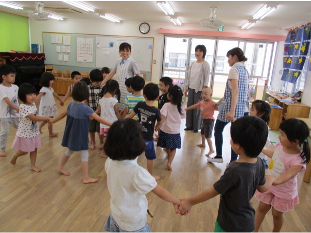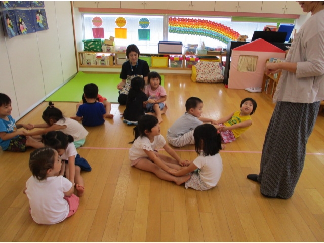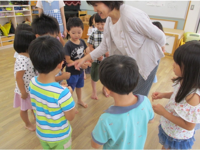 今日は、わらべうた指導の高橋先生に来ていただいてわらべうたで遊びました。その様子をご紹介します。