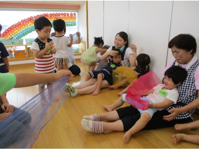 色とりどりのシフォンスカーフを上下にひらひらさせながら、最後に顔を隠して いないいないばあっ!をする遊びです。