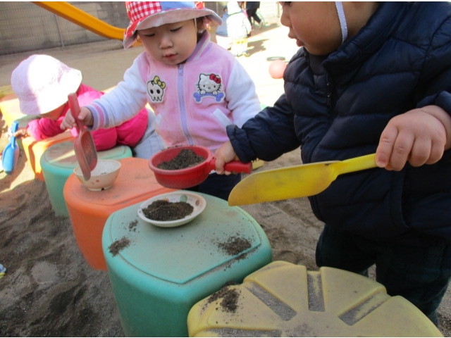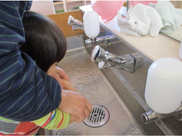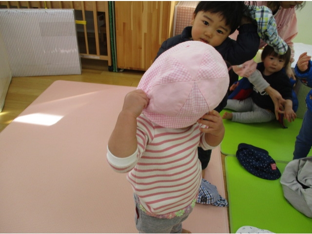 「今日は、お外に行って遊ぼうね。」と言うと、大きく頷いて頭を触ったり、帽子入れを指差す子ども達です。