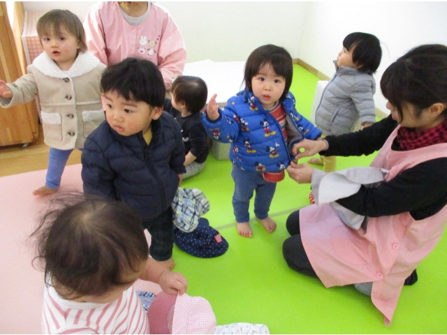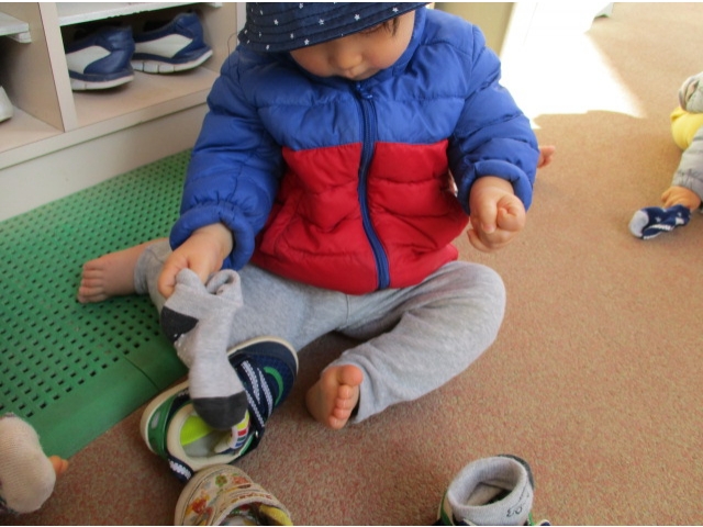 帽子は上手くかぶれない事も多いけど、自分でやりたい気持ちがいっぱいで、難しい時は、「やって」や「ん」と持ってきてくれます。ジャンバーや靴も自分のを探して、手や足を通そうとしています。