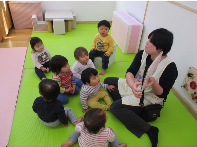 この日は、「どれにしようかな?」と本をみせると、全員一致で1冊の本を選びました。中には椅子を動かして座って見る子もいました。