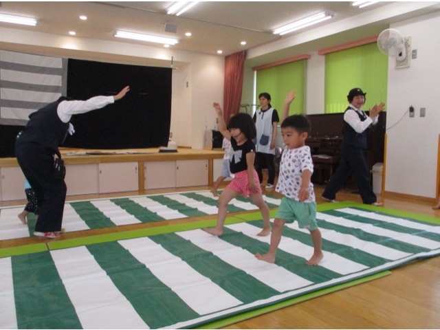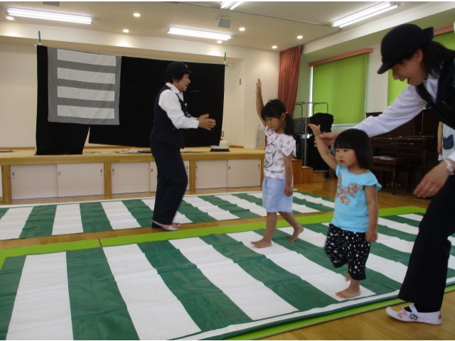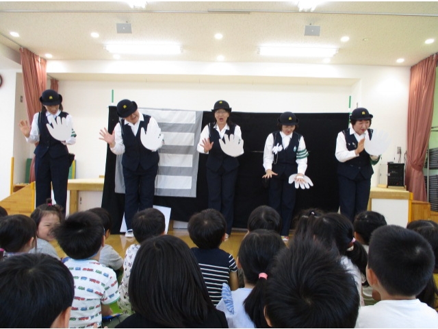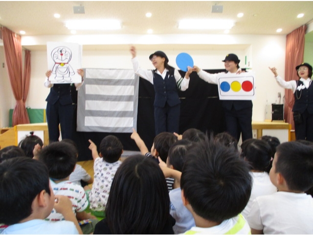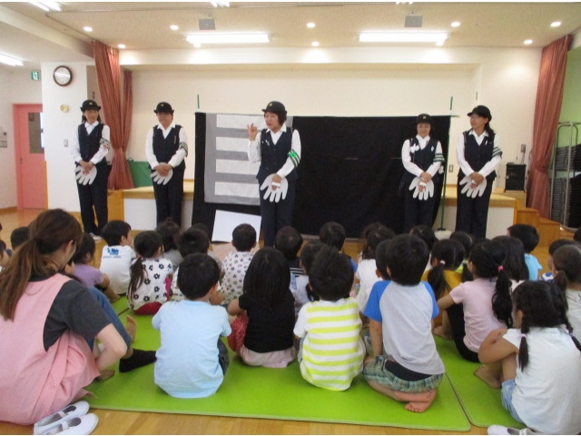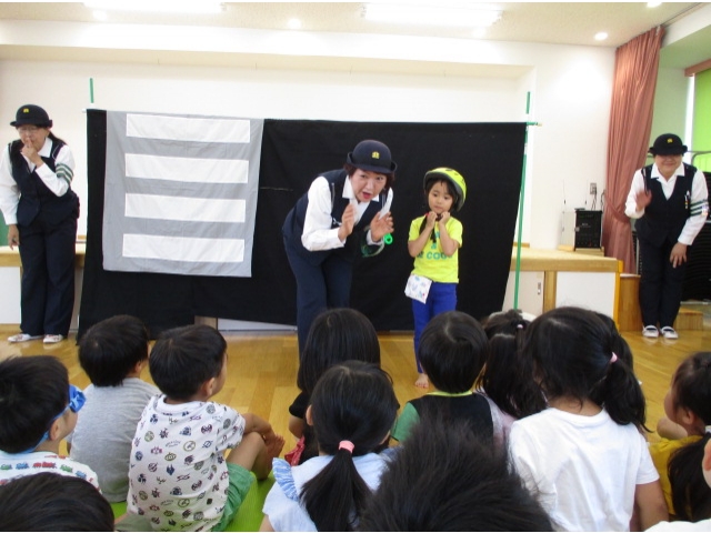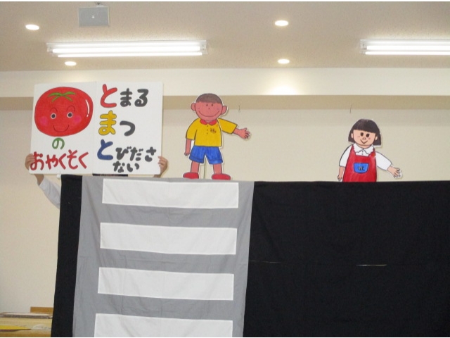 手あそび歌から始まり、右・右どっちなどのペープサートを見て、交通ルールを分かりやすく知ることができて子ども達は興味津々で話を聞くことができました