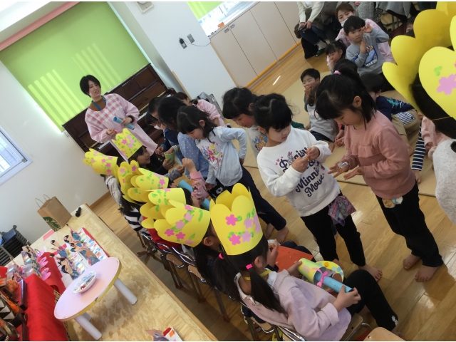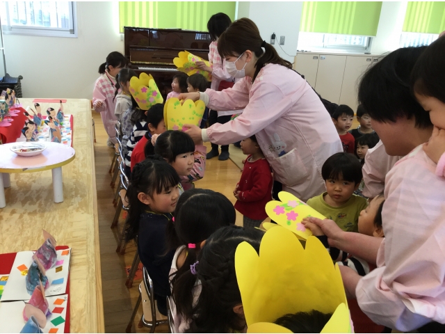 ばら組さんの卒園をお祝いし、0歳児から5歳児全員が集まり、優しく一緒に遊んでくれたり、お世話をしてくれたばら組さんに在園児から手作りのプレゼントを贈りました