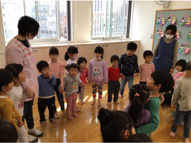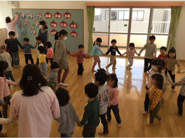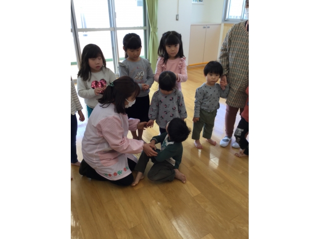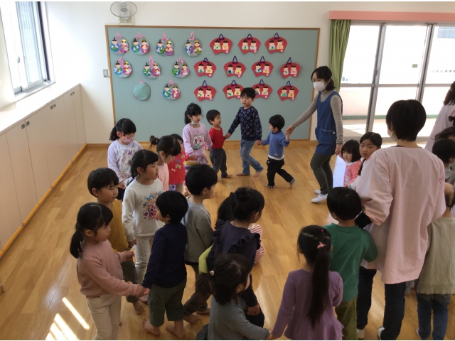 遊戯室で赤チーム、白チームに分かれて集団遊び(花いちもんめ、かごめかごめ)を行いました。お世話のお友だちと一緒に教えてもらいながら楽しみました。