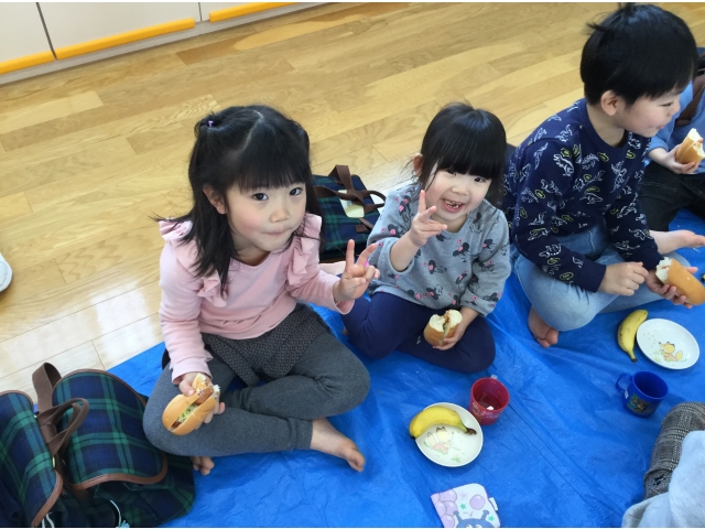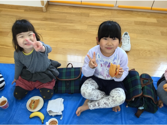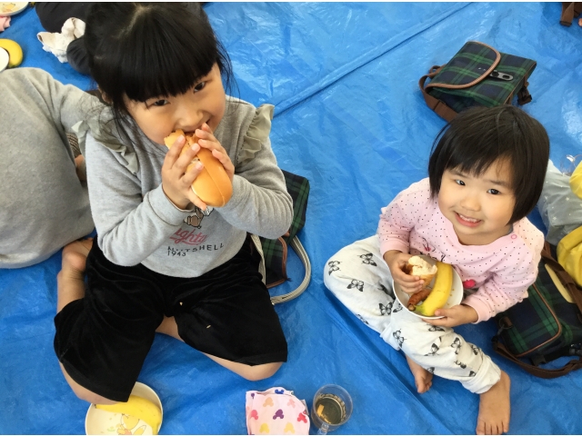 お世話のお友だちとレジャーシートの上に座り、この日のメニューはホットドッグとバナナでした。みんなで「ピクニック気分だね」と話しながら食べました。