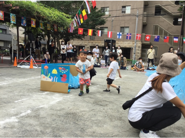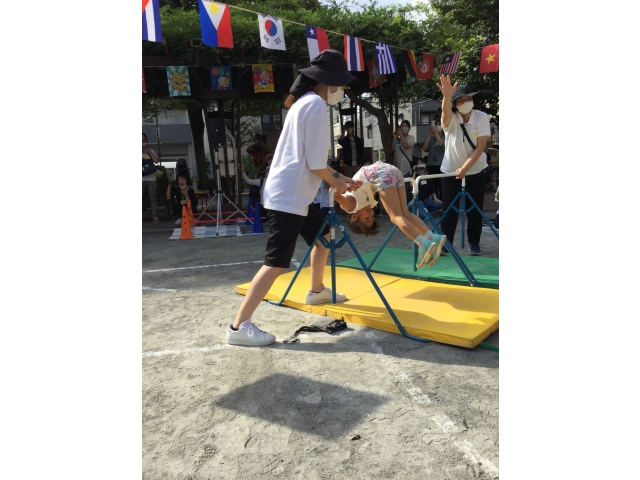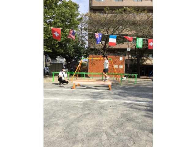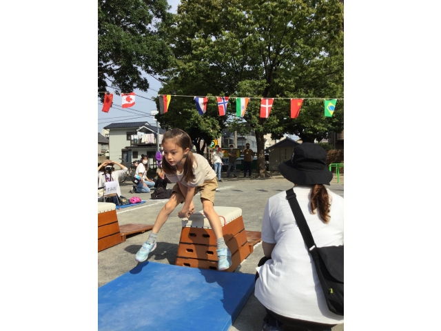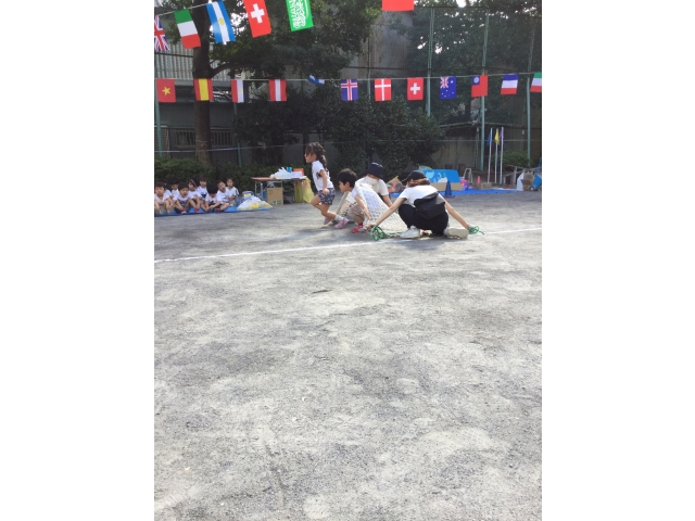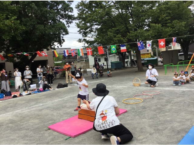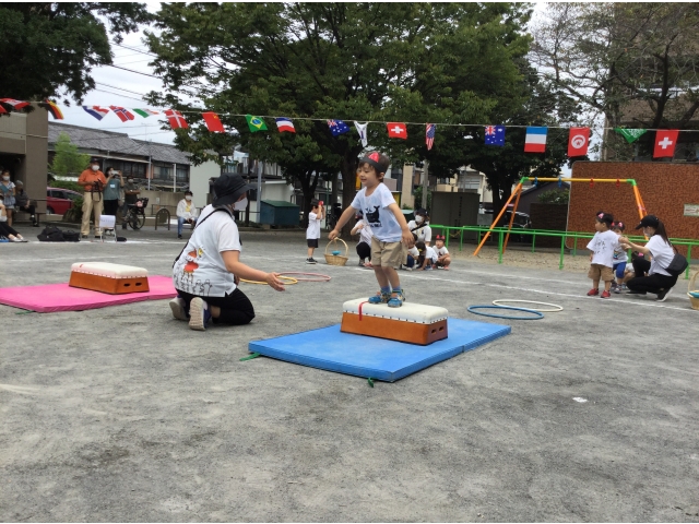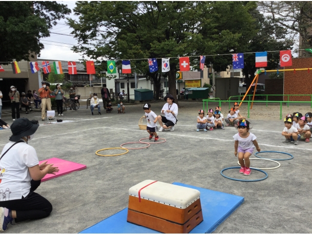 2・3歳児の競技では、自分達で色塗りをした猫の耳を付けて、フラフープの所を飛んでとび箱の山を乗り越えて魚を取って次のお友だちにタッチしていました