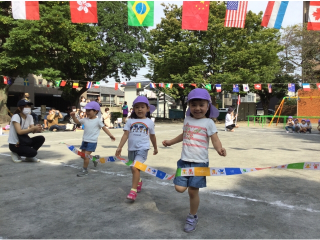 かけっこでは2歳児は担任に向かって、3歳児はゴールテープに向かって走り抜けて行きました