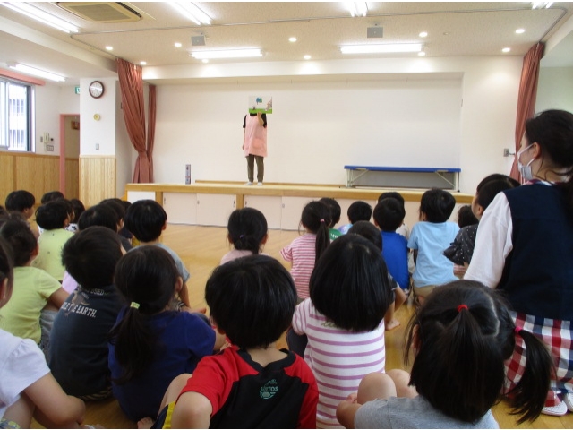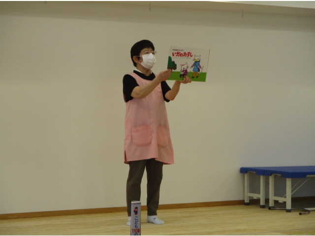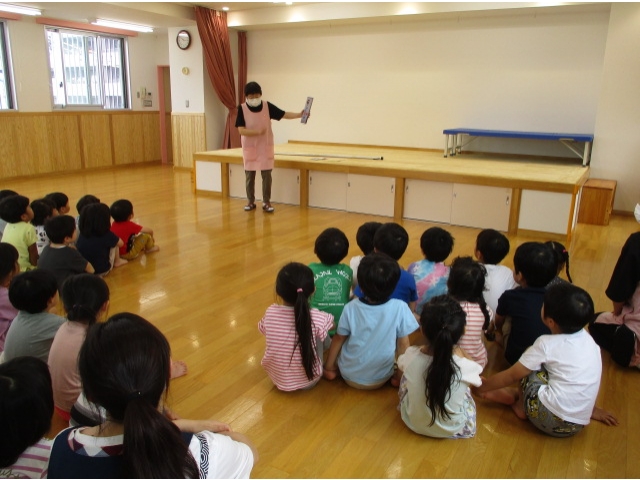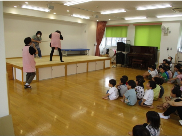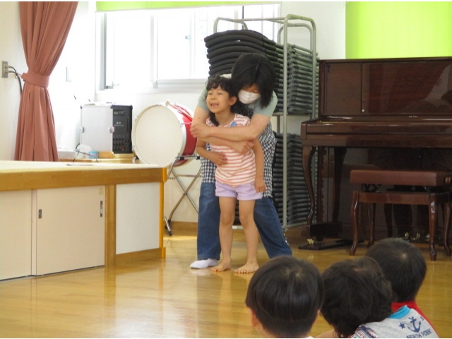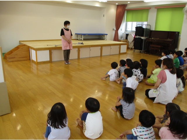 不審者訓練の紙芝居では、「いかのおすし」という約束事をみんなで確認しながらみました。いかない、乗らない、大きな声、すぐ逃げる、知らせる の5の約束事を皆で声に出して、覚えました。