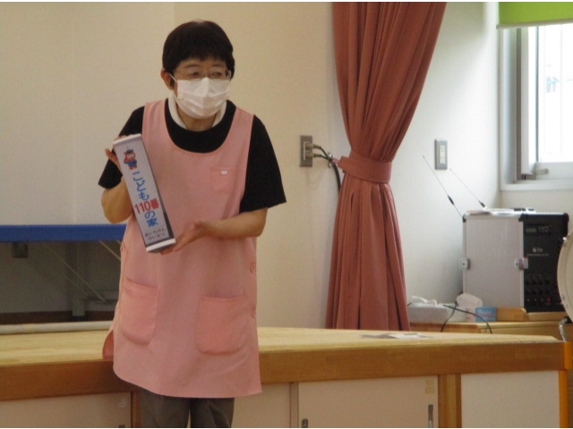 三階遊戯室に集まり、不審者と出会ってしまったら、どうしたらよいかのお話を園長先生にして頂きました。