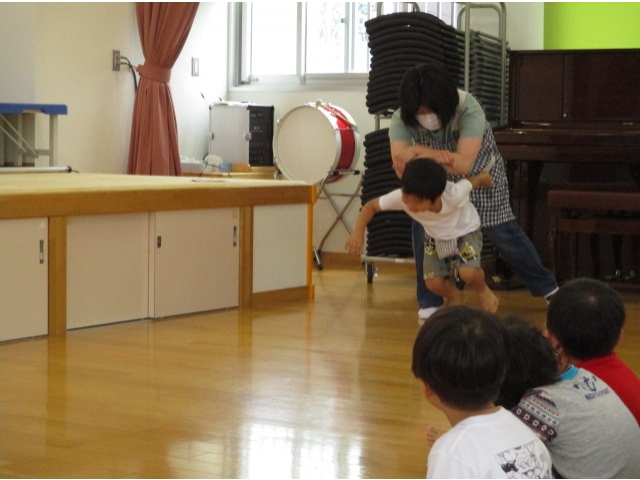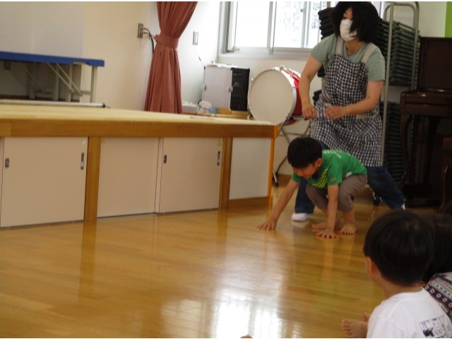年長児クラスのお友だちは、もしも不審な人につかまってしまったら、どう逃げればいいのかの見本を順番に見せてくれました。腕をあげて、しゃがみ、大きな声で「たすけてー!」と言いながら、110番の家に逃げる練習をしましたよ。