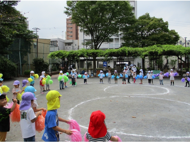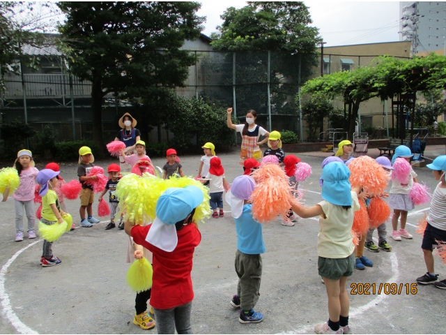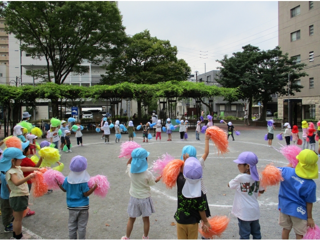 七色のポンポンを持って、2~5歳児で、お世話の子と踊っています。 みんなで、両手を挙げて、ポンポンを挙げるところは、とてもきれいですよ