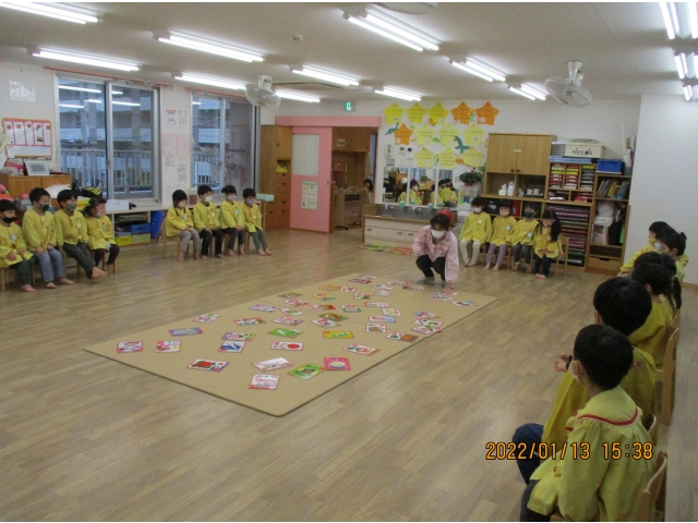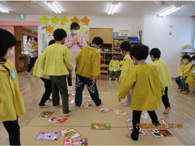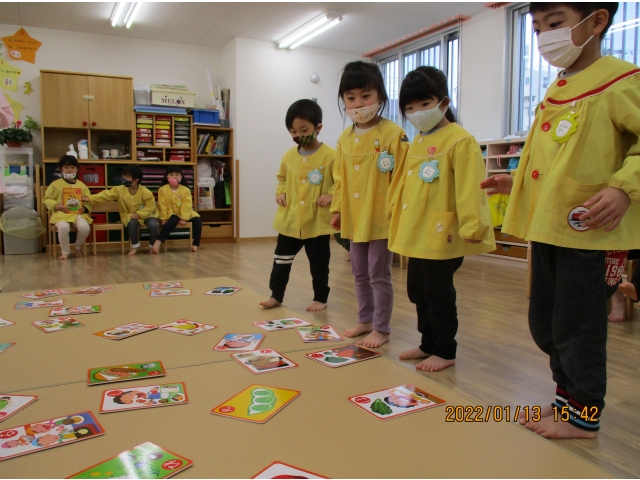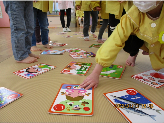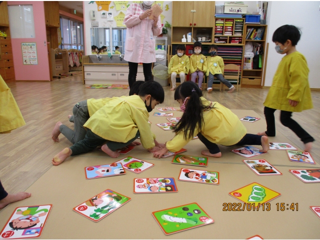 ゆり・ばら組にある、大きなかるたでジャンボかるた大会をしました。