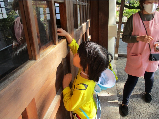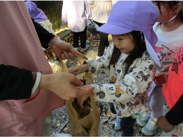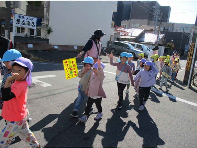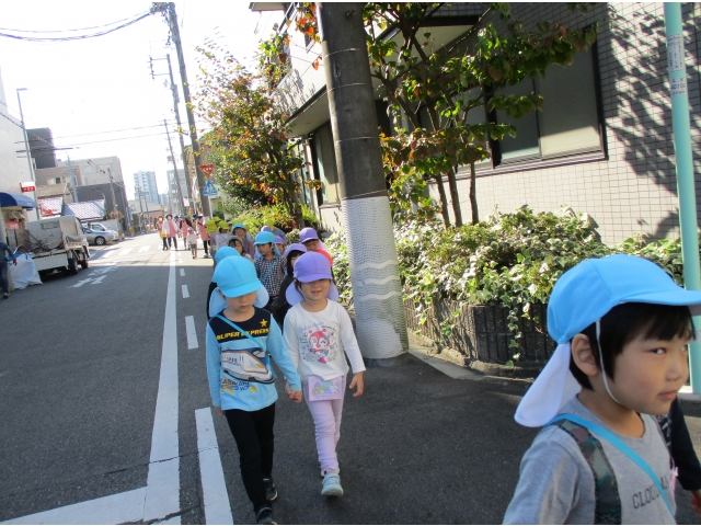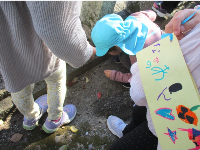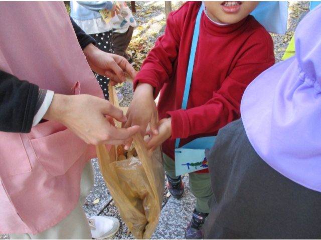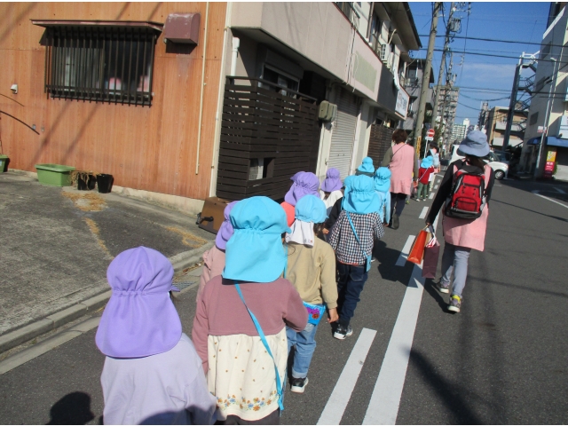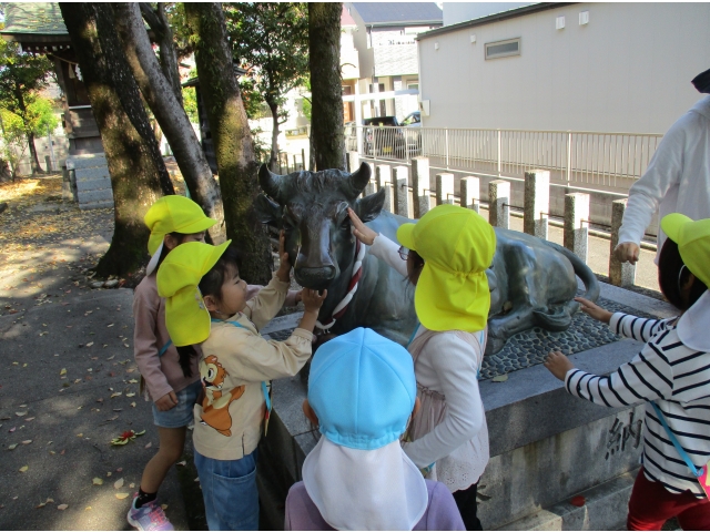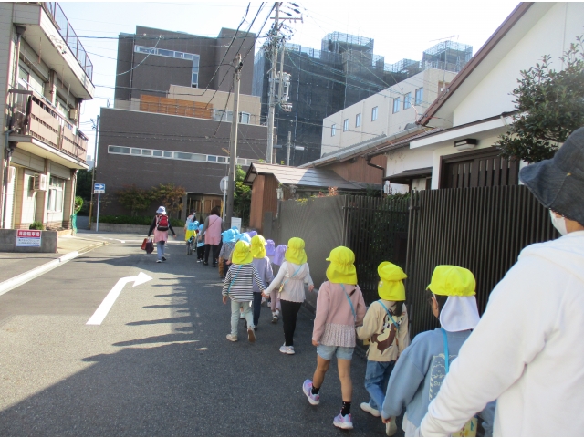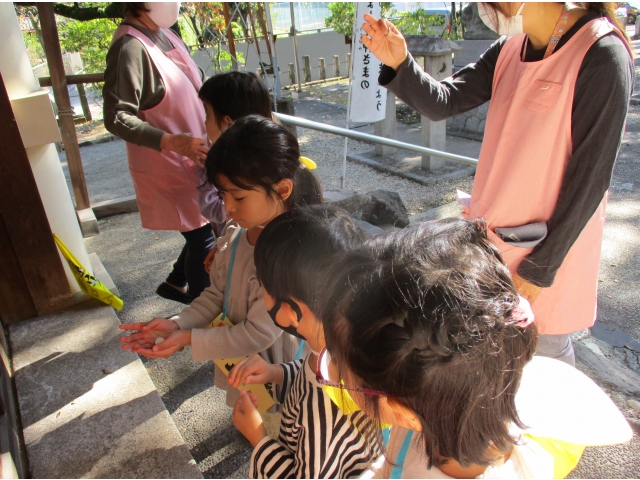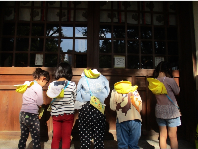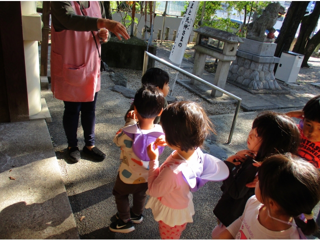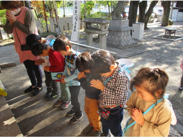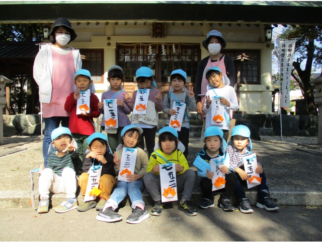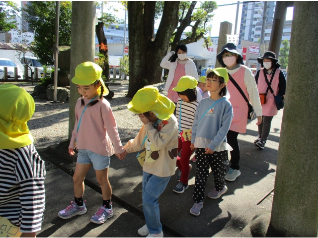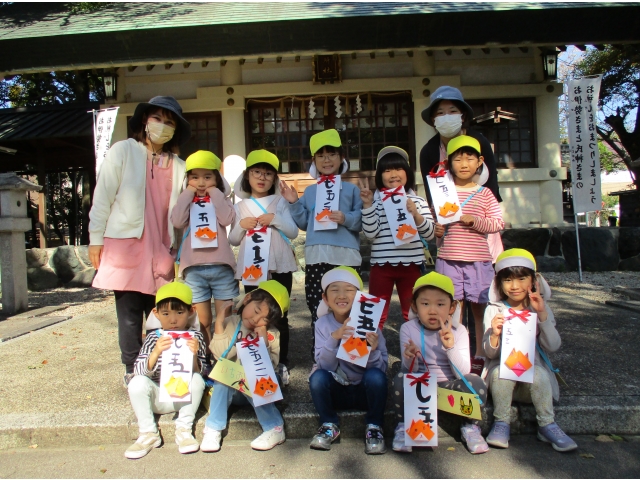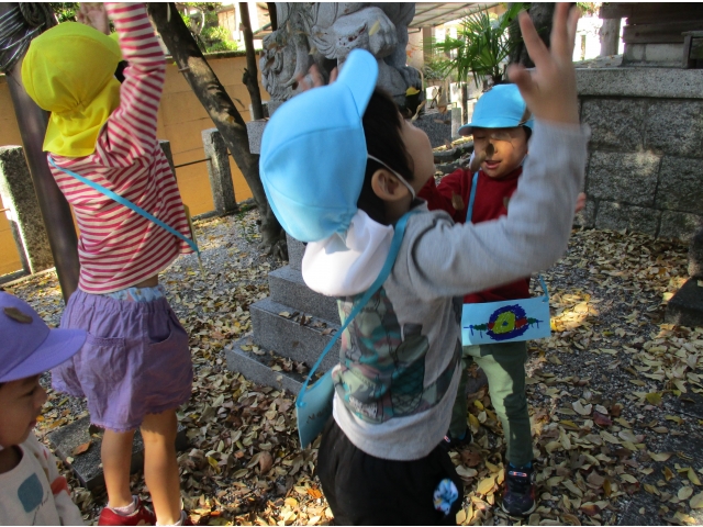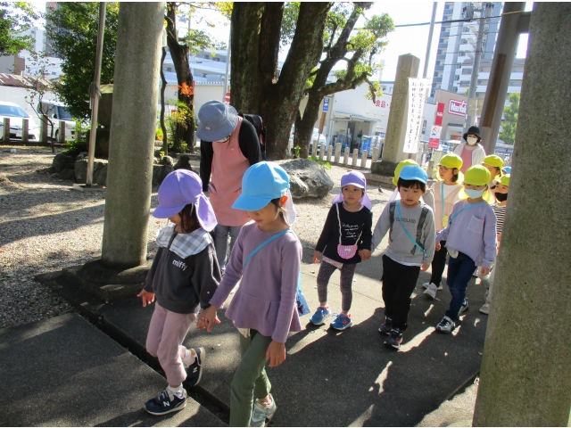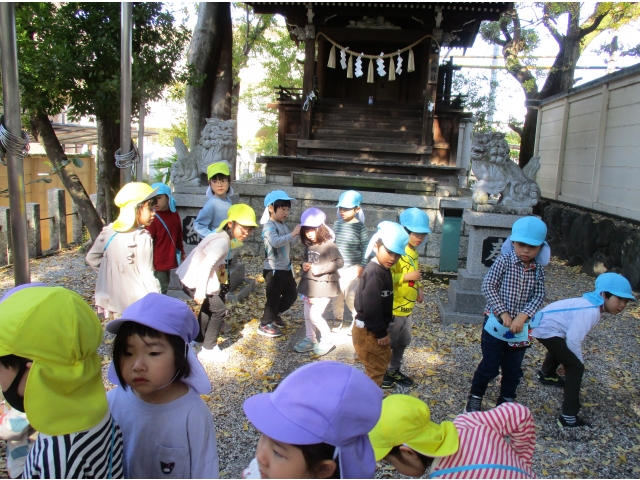 過ごしやすい快晴の天気の中、3~5歳児で七五三参りに行きました。落ち葉拾いのポシェットを肩に掛け、お友だちと手をつなぎ、六所社まで歩きました! お友だちや先生と会話をしながら、元気よく歩いて行くことができました!