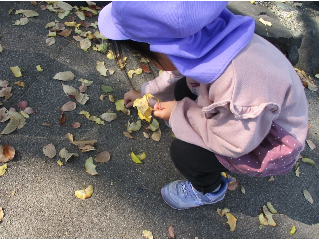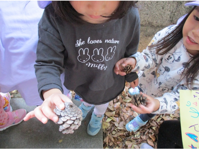 いちょうの葉やまつぼっくりを見つけて、大喜びな子どもたち。