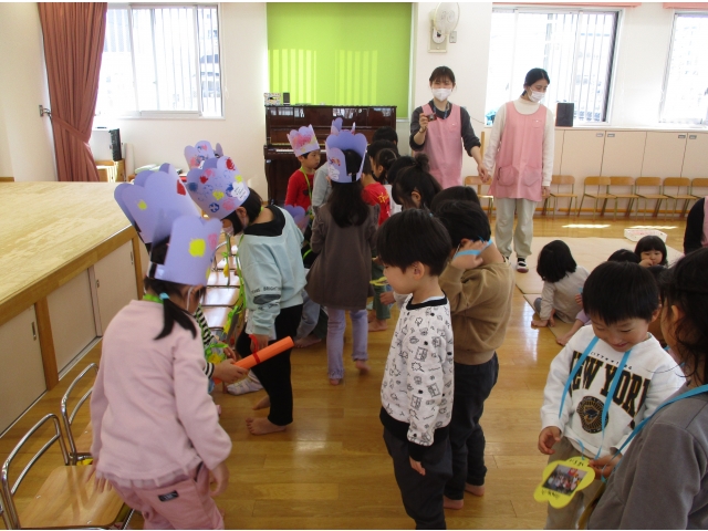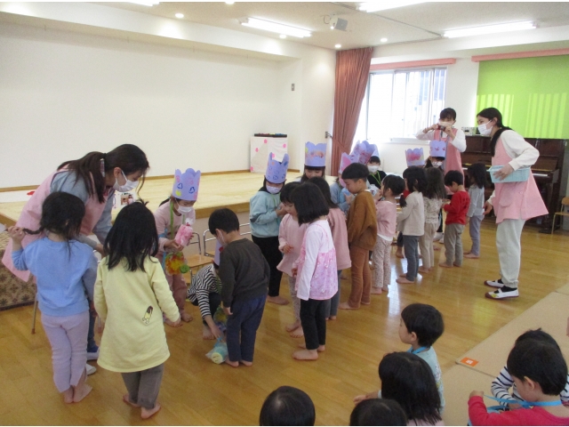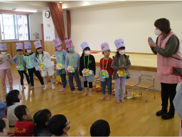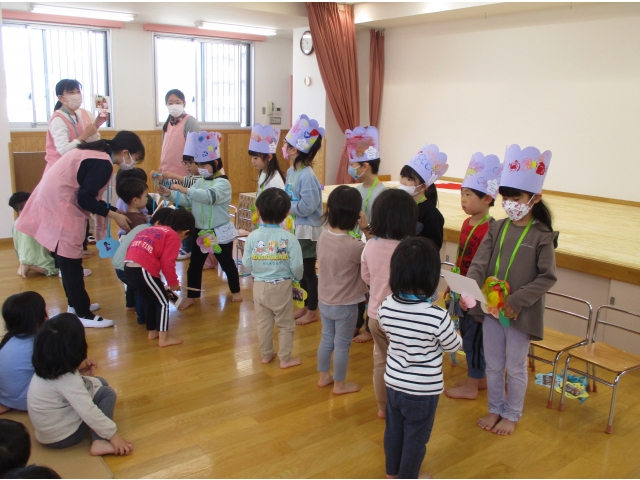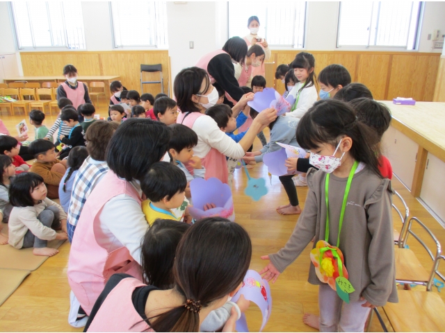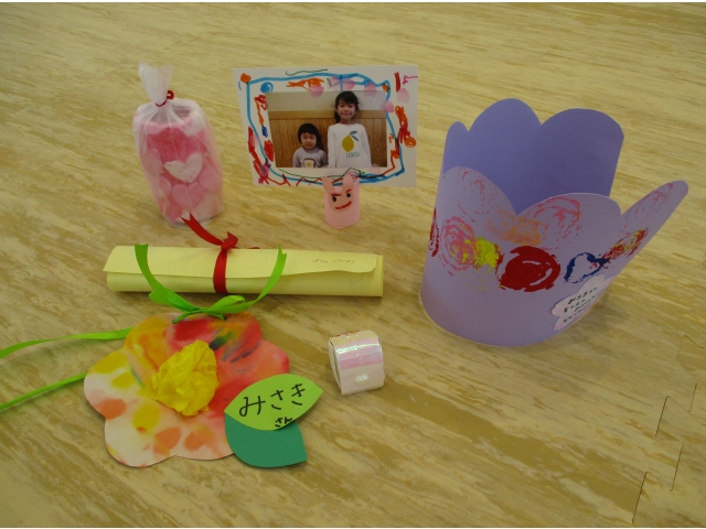いつも優しくお世話をしてくれたり、遊んでくれたお兄さん、お姉さんに感謝の気持ちを込めて、各クラスでお祝いのプレゼントを作りました。