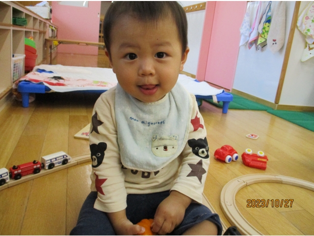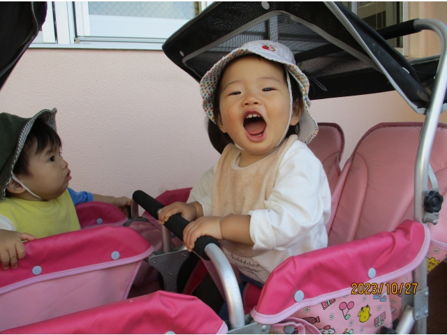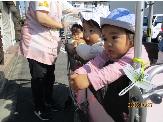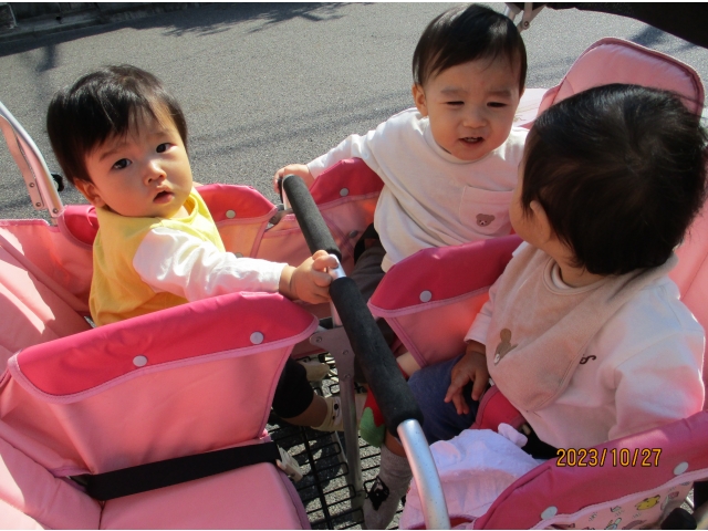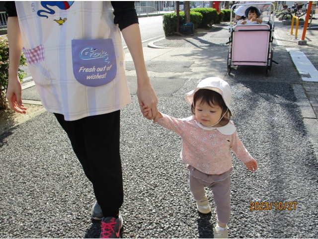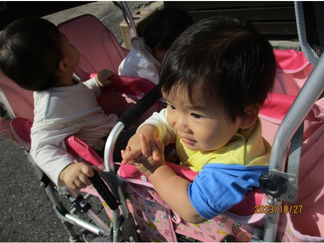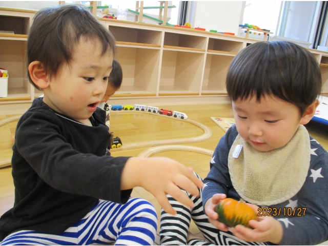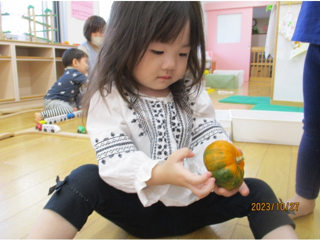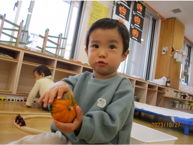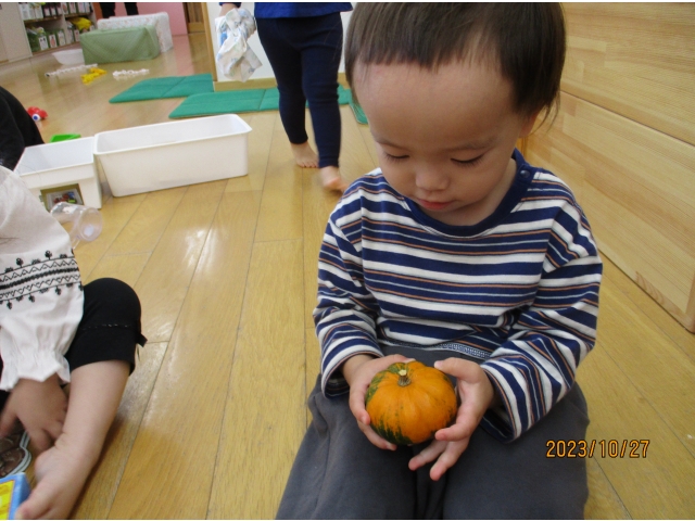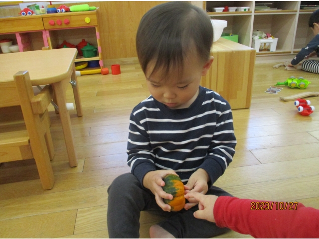 たんぽぽ組ともも組はそれぞれ外へ散歩に行ったり、野菜を観察したりして“秋”を感じて、満喫しました。お外は秋晴れの天気で良い気持ち、初めてのイチョウにドキドキのたんぽぽ組さん。そして初めて手に取るミニカボチャに不思議そうなもも組さんでした。