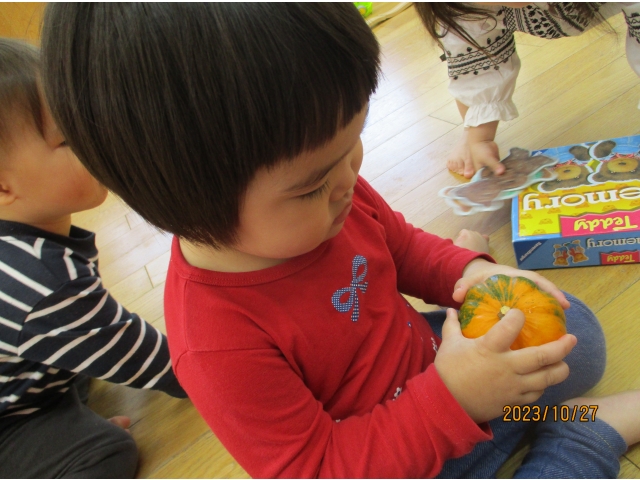 順番がくると夢中になって手にしたミニカボチャを見ながら