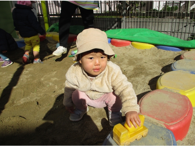 1歳児クラスでは、お友だちとのやり取りが増え始め、遊びの中でも物の貸し借りをしたり、一緒にやろう?と誘ったりと関わりが多く見られます。花のつぼみを見つけ、友だちや職員へ伝える子もいれば、1人で車の玩具を使って並べる子もいたりと一人ひとりがのびのびと過ごしています。