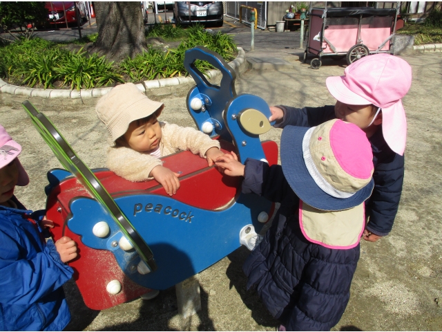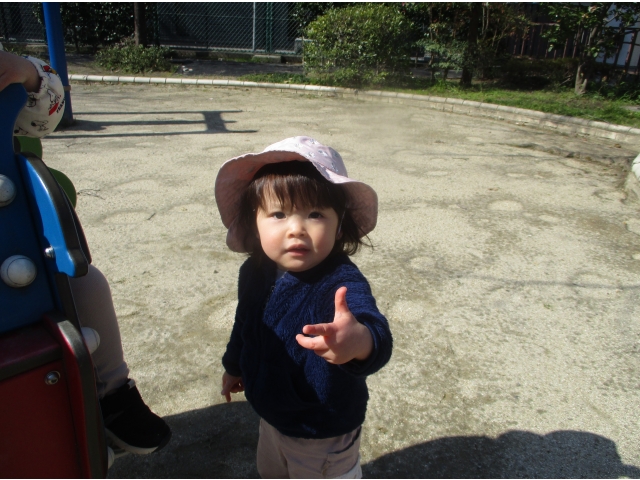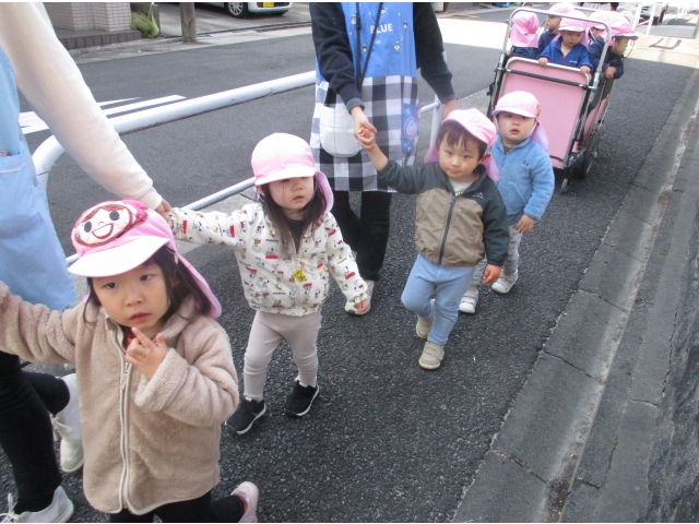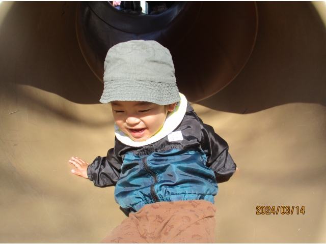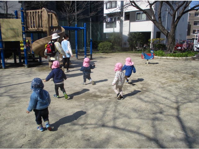 すべり台から「ばあっ!」と滑り降りてくる子や先生たちを「まてまて~」と追いかけっこする子など、広々とした公園に、いつも以上に嬉しそうに遊んでました。0,1歳児のクラスの子との関わりも多く見られ、充実した一日となりました。また、桜が咲く頃に、機会があればお散歩に行きたいなと思います。