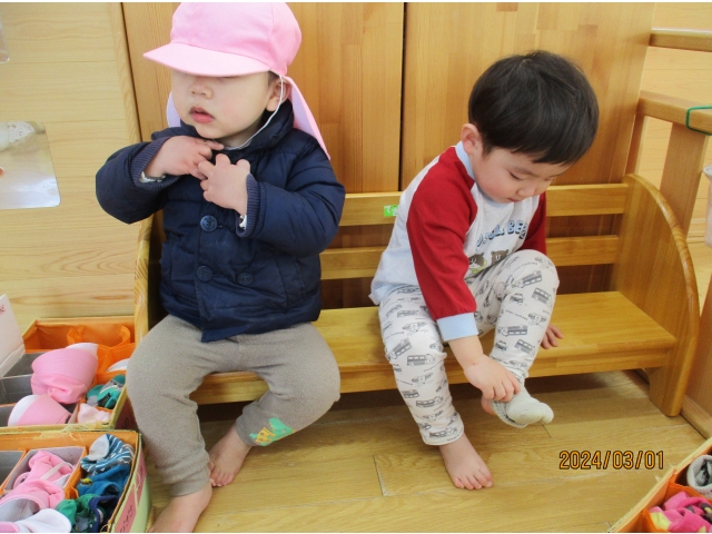 自ら靴下やズボンを履き替えたり、一人でやるから先生見ていてねとアピールしたりとあっという間に心も身体も成長したなぁと感じる一年でした!来年度もたくましく、すくすく成長していきますように。