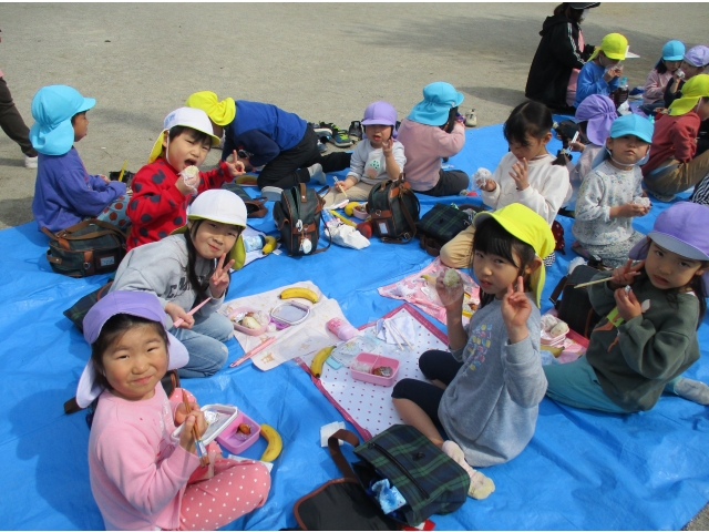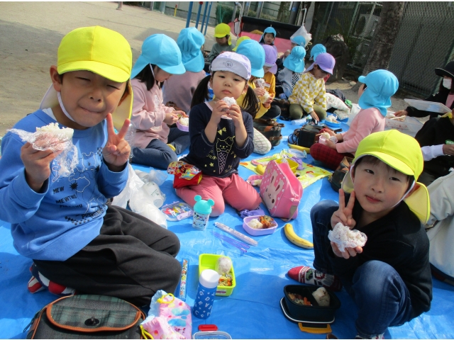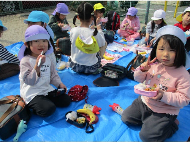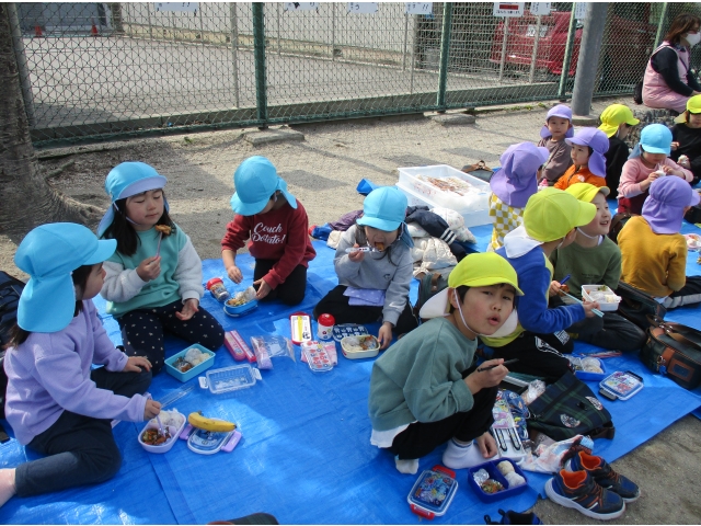 2歳児さんは先に保育園に戻り、3~5歳児さんはお弁当箱に入れたお給食を公園で食べました!