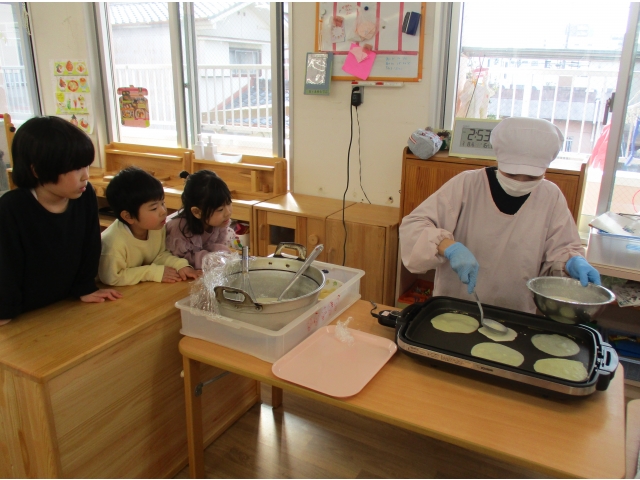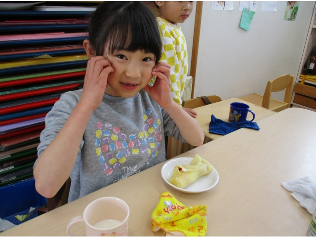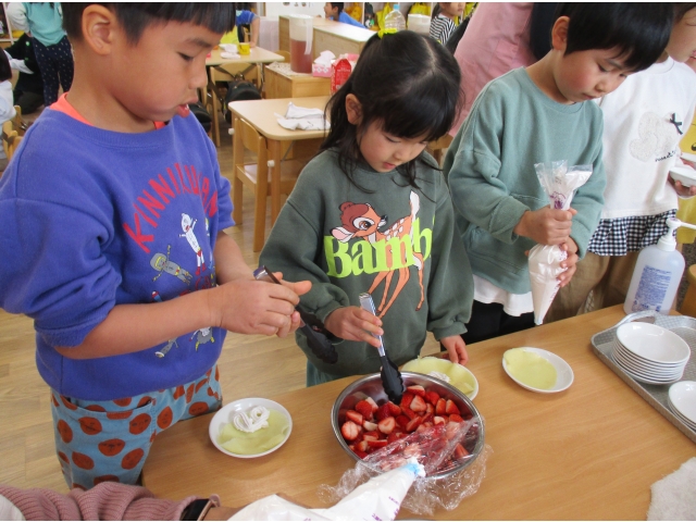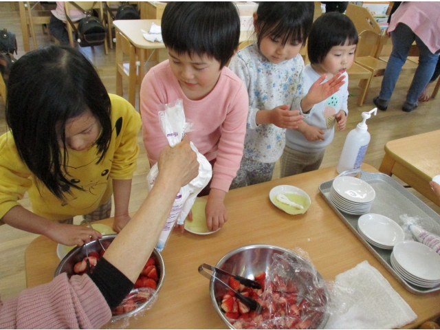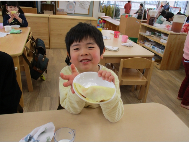 お部屋に給食の先生が来てくれて、目の前で焼いてくれたクレープにホイップクリームやイチゴを自分たちで思い思いにトッピングしていきました。