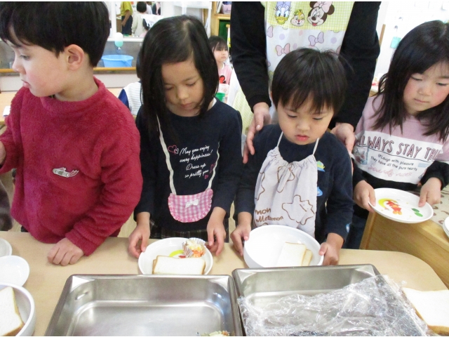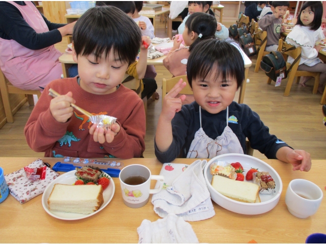 お別れ会は終わり、お楽しみの給食。給食はバイキング方式でした。ハンバーグにポテトサラダ、いちごのみんな大好きなメニュー。2~5歳児は一緒に食べました。
