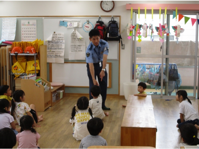 訓練の後は、3~5歳児は警察の方に紙芝居を通して身を守る方法を教えてもらいました。