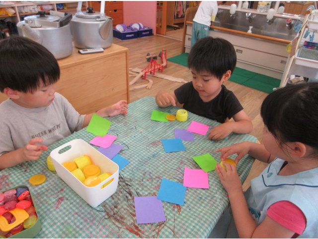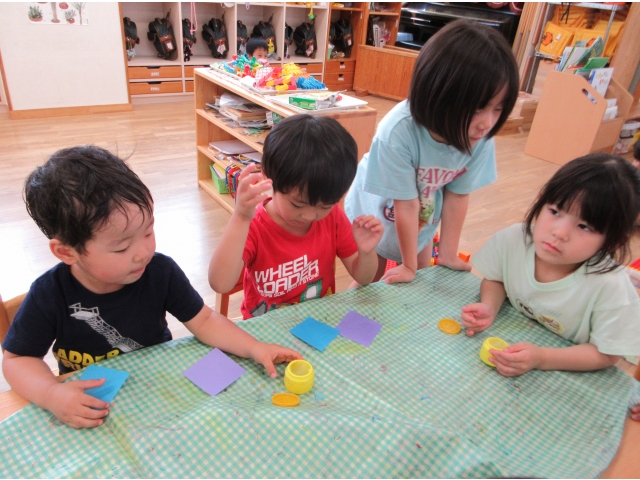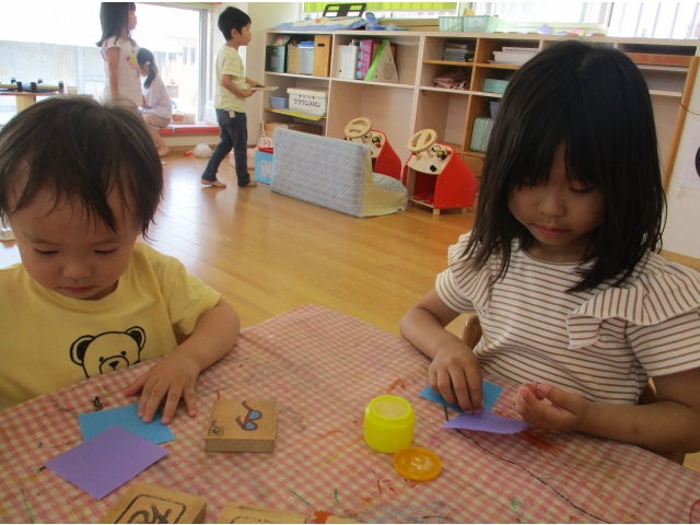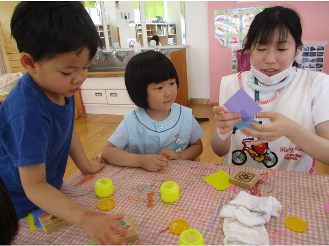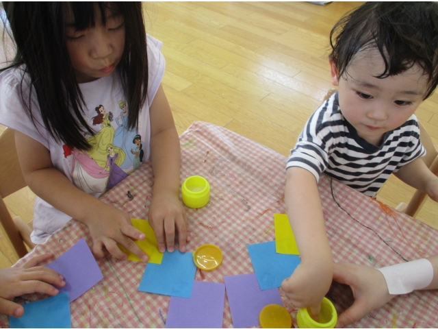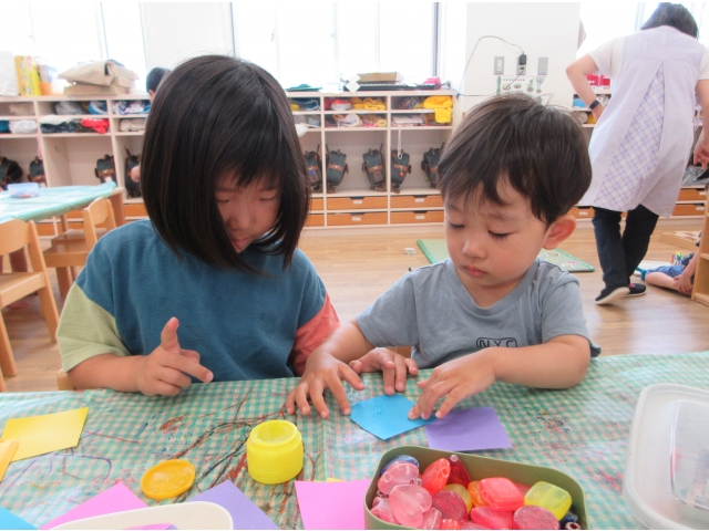 年長さんが二歳児さんにのりの付け方を教え、四歳児さんは三歳児さんと一緒に楽しみながら作っていきました。