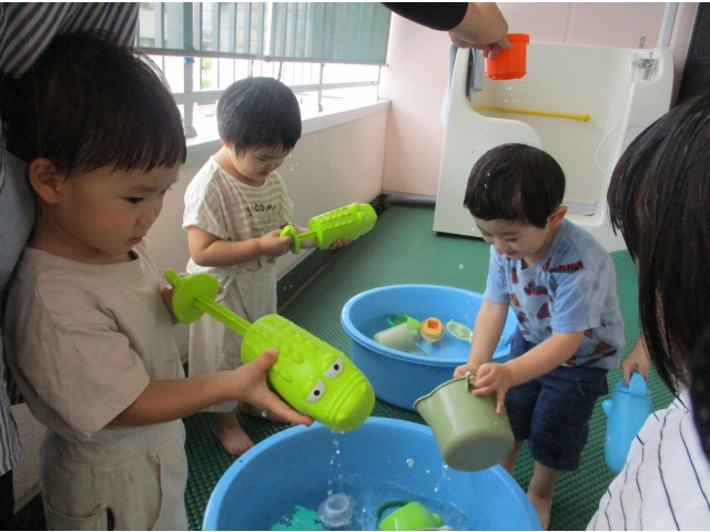 朝から楽しみにしている子が多く「今日は水遊びする?」と聞いてくる姿もあり、幼児さんは水鉄砲で水を掛け合って楽しんでいました!
