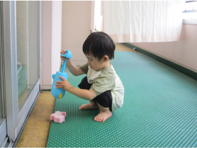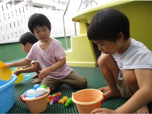 2歳児さんはスポンジに水を染み込ませてみたりバケツに玩具をいっぱい詰め込んだりして様々な遊び方をしていました。