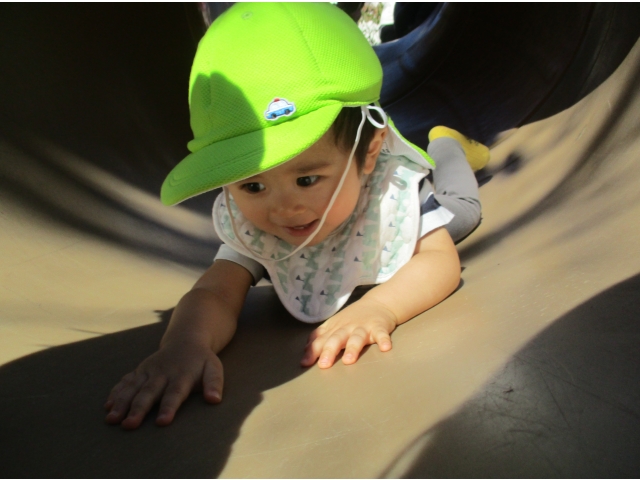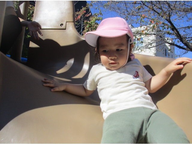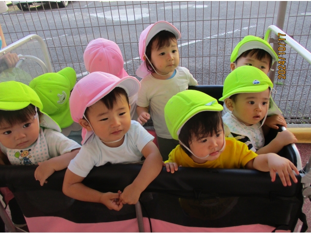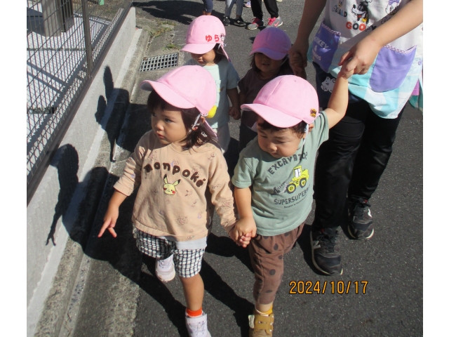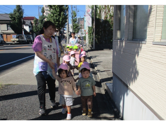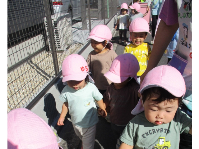 歩いていく子は車に気を付けて歩きます。ピンクの帽子の1歳児クラスのお友だちは並んで歩いています。