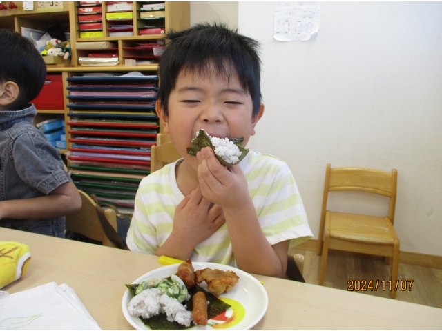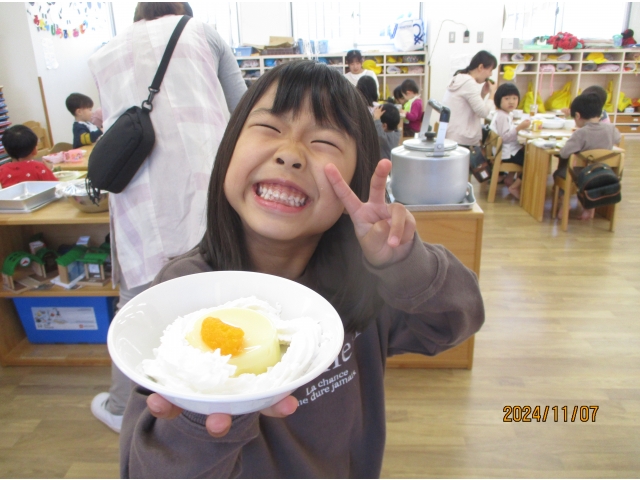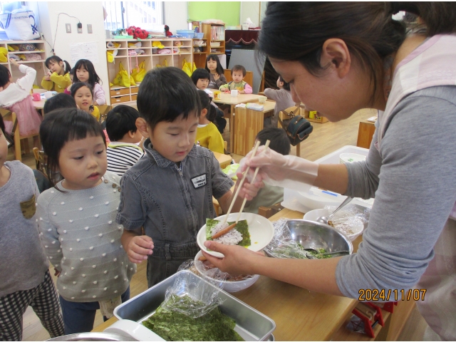 今日のメニューは手巻き寿司です!デザートはプリンアラモード!みんな美味しそうに食べていました!