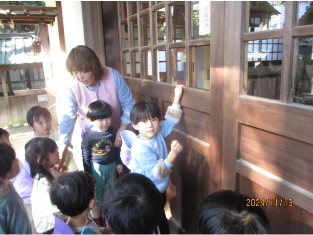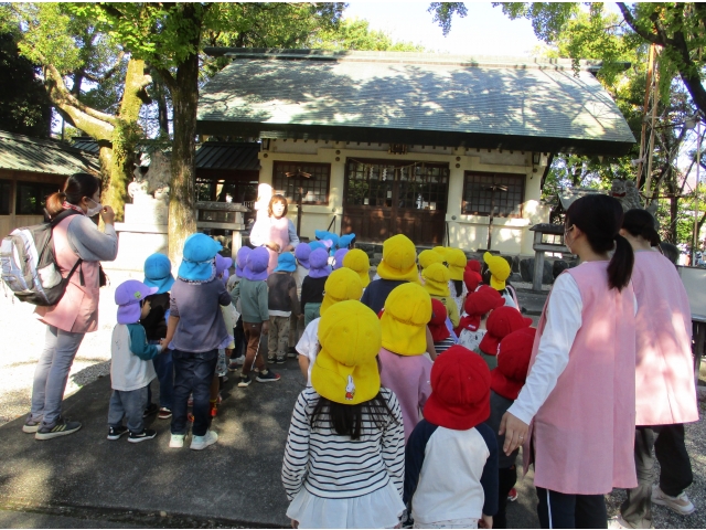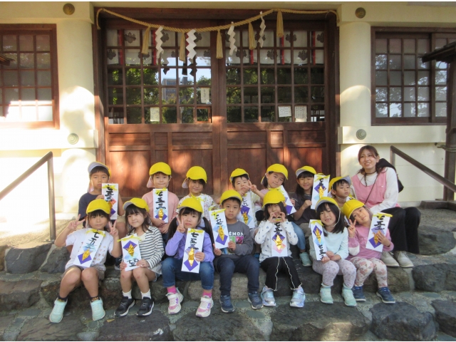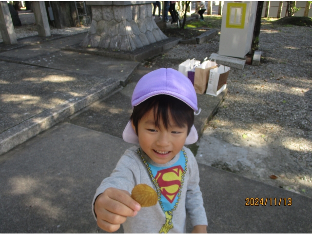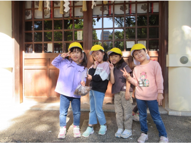 天気も気温にも恵まれ、手を繋いで神社に出発しました。到着すると2歳児クラスから順番にお参りをしました。「帽子を脱ぎ、二礼二拍手一礼」という参拝方法を園長先生や担任などの動きを見て、真似て行っていました。千歳飴の袋はクラスごとに、2歳児クラスはどんぐり、3歳児クラスはきのこ、4歳児クラスは赤の折り鶴、5歳児クラスは金の折り鶴が貼られており、千歳飴の袋を持って写真を撮りました。