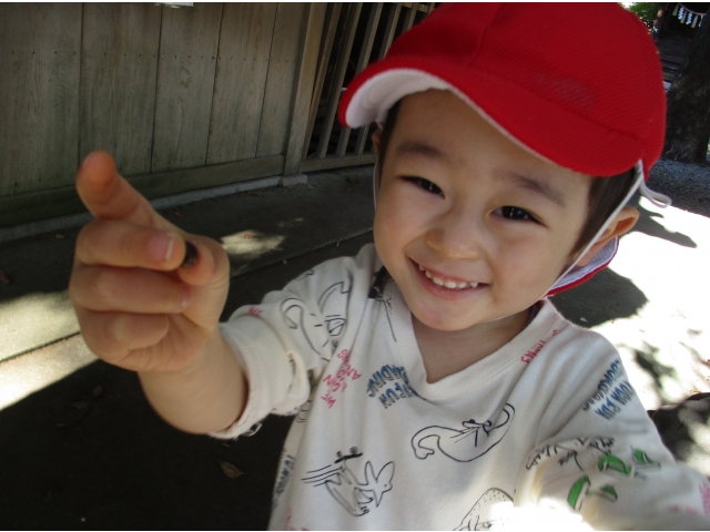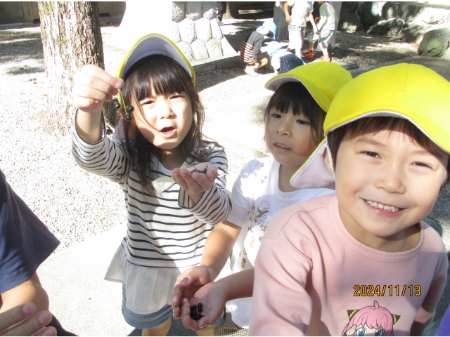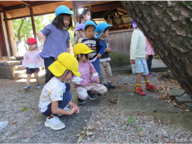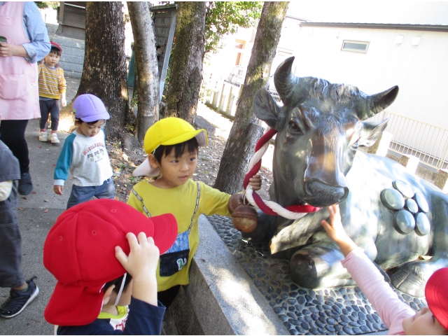 どんぐりや松ぼっくりなど、秋を感じるものがいっぱい落ちており、「どんぐりあったよ!こっち、2歳児のお友だちおいで!」と上の子が下の子へ関わったり、撫で牛にお参りをしたりとのびのびと遊んでいました。各クラスが落ち葉や木の実など袋いっぱいになって持ち帰っていましたよ。残り約5か月、みんなが元気にすくすくと大きくなってくれますように・・・