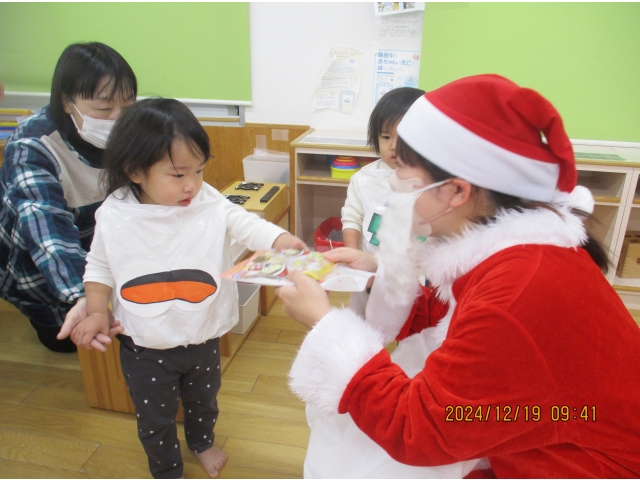 サンタさんがお部屋に来てくれると、少しドキドキしながらもプレゼントを貰って帰りにはバイバーイ!とサンタさんをお部屋の出口までお見送りしていました!