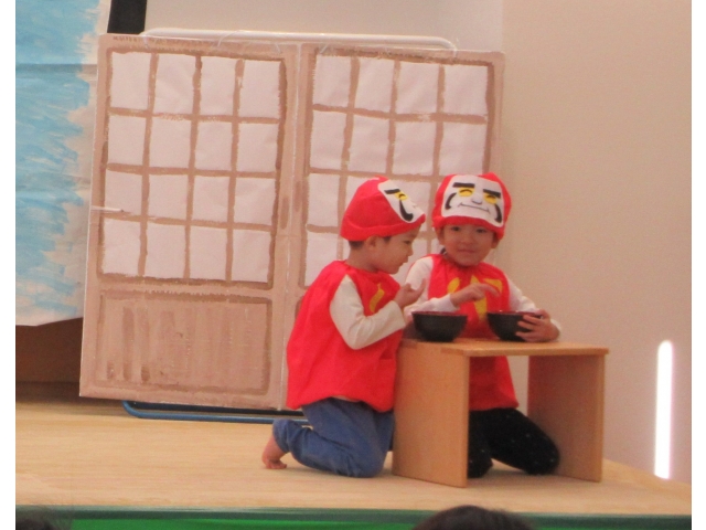 ゆり組さんは人形劇で楽しんでいたお話「だるまちゃんとてんぐちゃん」の劇を、