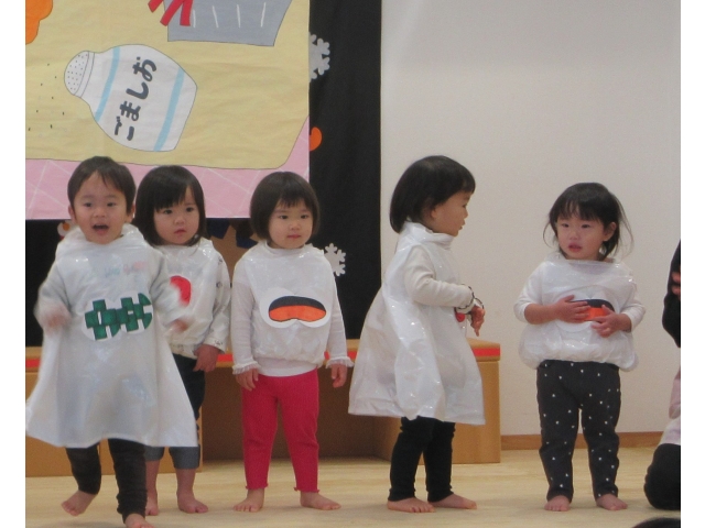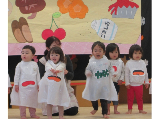 もも組さんはお部屋で楽しんで歌っていた「おべんとうばこのうた」を色々な味の“おにぎり”に変身して発表しました!