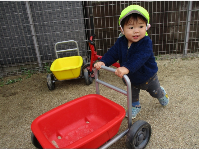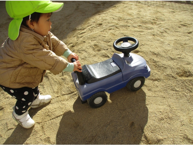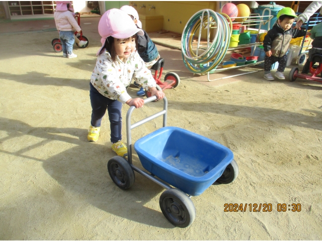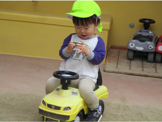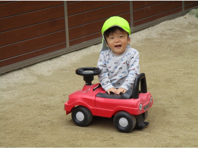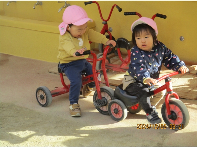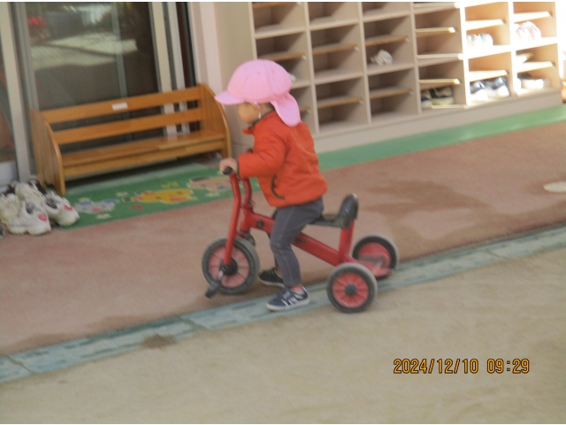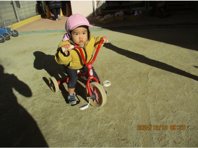 1歳児クラスのお友だちは三輪車ものりこなしています。