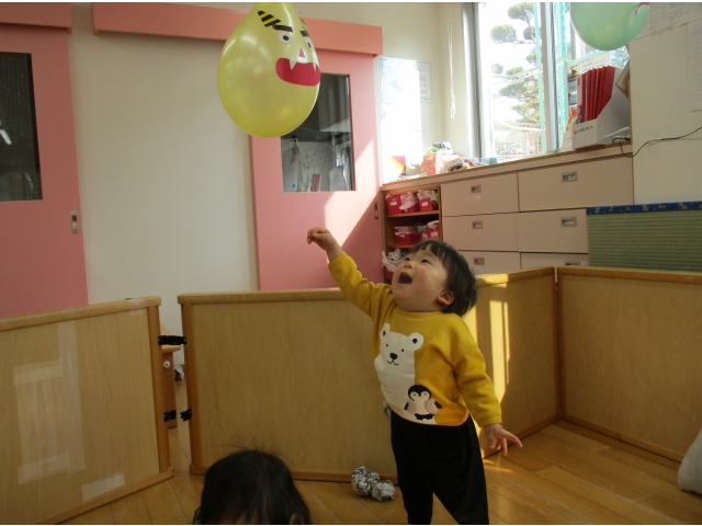 節分の日はたんぽぽ組、もも組さんに分かれて豆まきをしました!豆まきの歌を歌ってから風船鬼に向かって豆を投げましたよ~