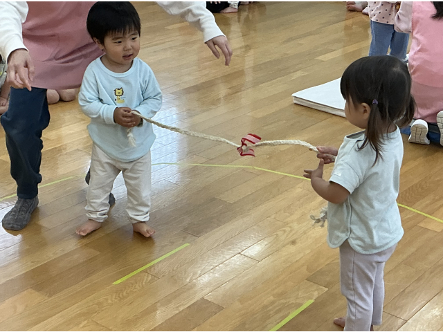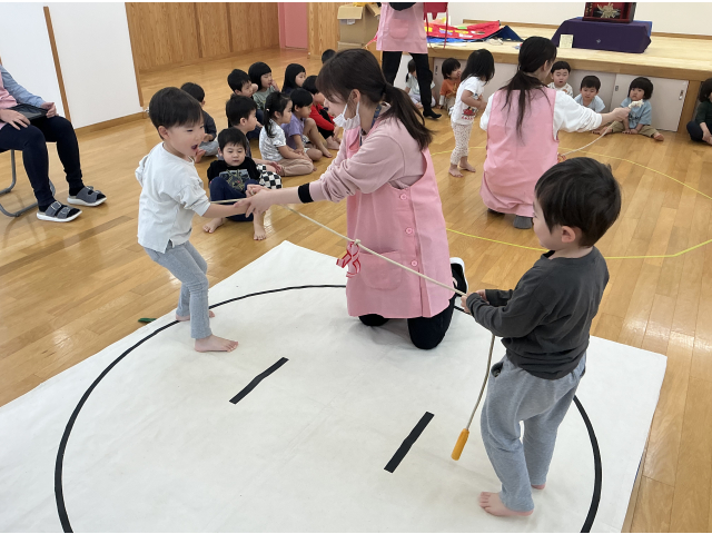 2,3歳児さんは縄跳びを使ったひっぱり相撲。負けて泣いてしまう子もいましたが、迫力満点の年長組のお相撲を見ると泣くのを忘れて目を輝かせて全力で応援していました。
