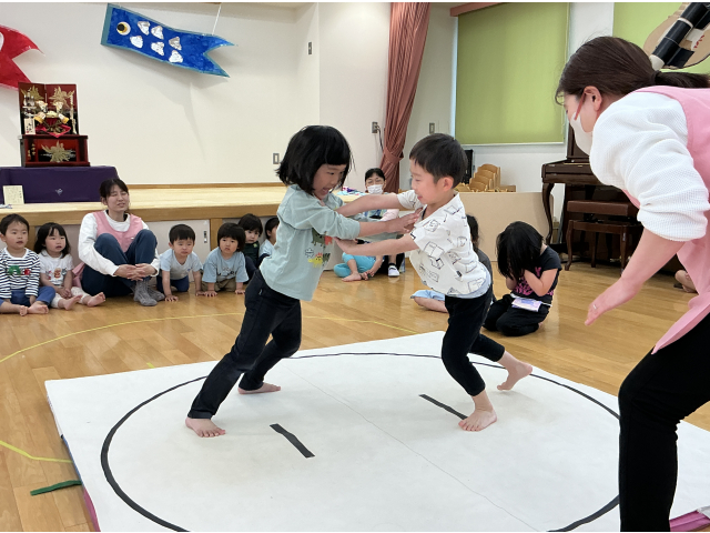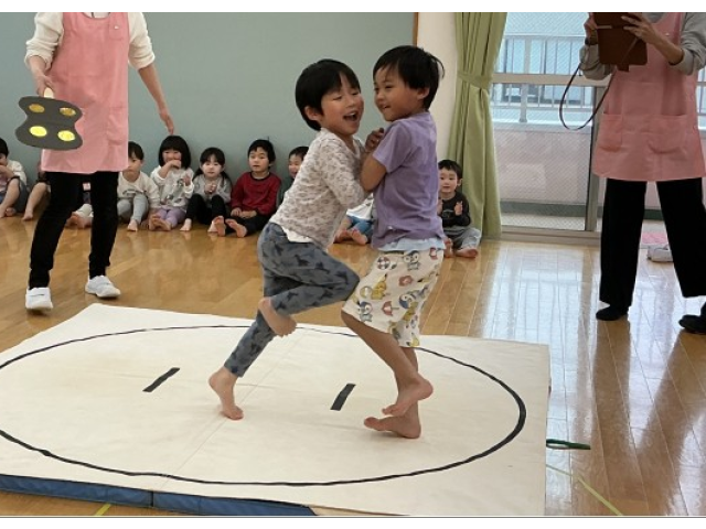 4歳児さんはけんけん相撲、5歳児さんは押し相撲です。練習の時はあまり意欲的ではなかった子もいましたが、本番では友だちの頑張る姿を見て真剣に取り組んでいました。