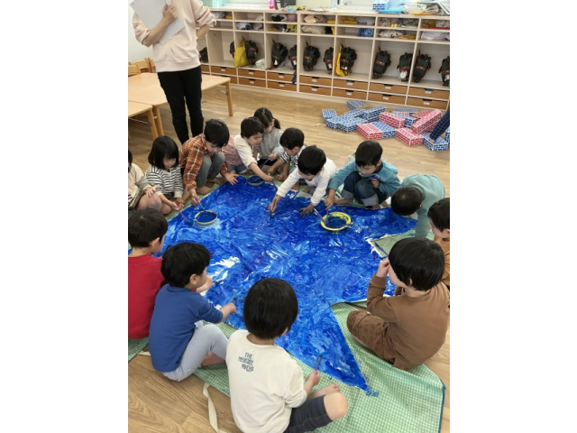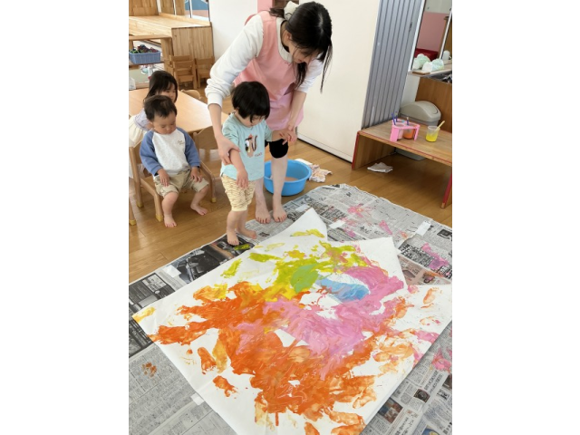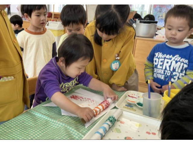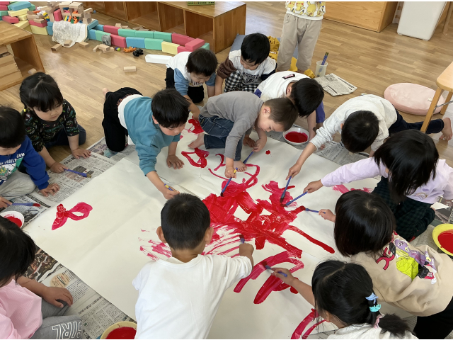 子どもの日にむけて2歳児クラス、3~5歳児のたてわりグループでそれぞれ園庭に飾る大きなこいのぼりと、個人で持ち帰るこいのぼりの制作を楽しみました。